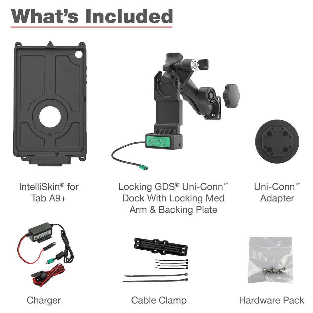 - Bundle includes the GDS® Uni-Conn™ right locking dock, Uni-Conn adapter, IntelliSkin® Next Gen for Samsung Tab A9+, C size double ball mount with medium arm, backing plate adapter, and cable clamp