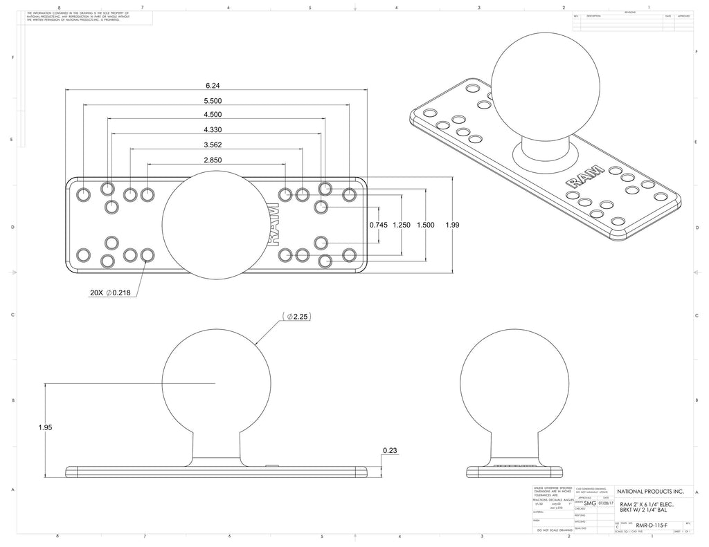 This rectangular aluminum base plate features multiple pre-drilled hole patterns to match a wide range of fishfinder gimbal brackets and marine electronics. The integrated 2.25" D size rubber ball provides vibration damping and rock-solid adjustability when paired with a compatible RAM D size double socket arm.