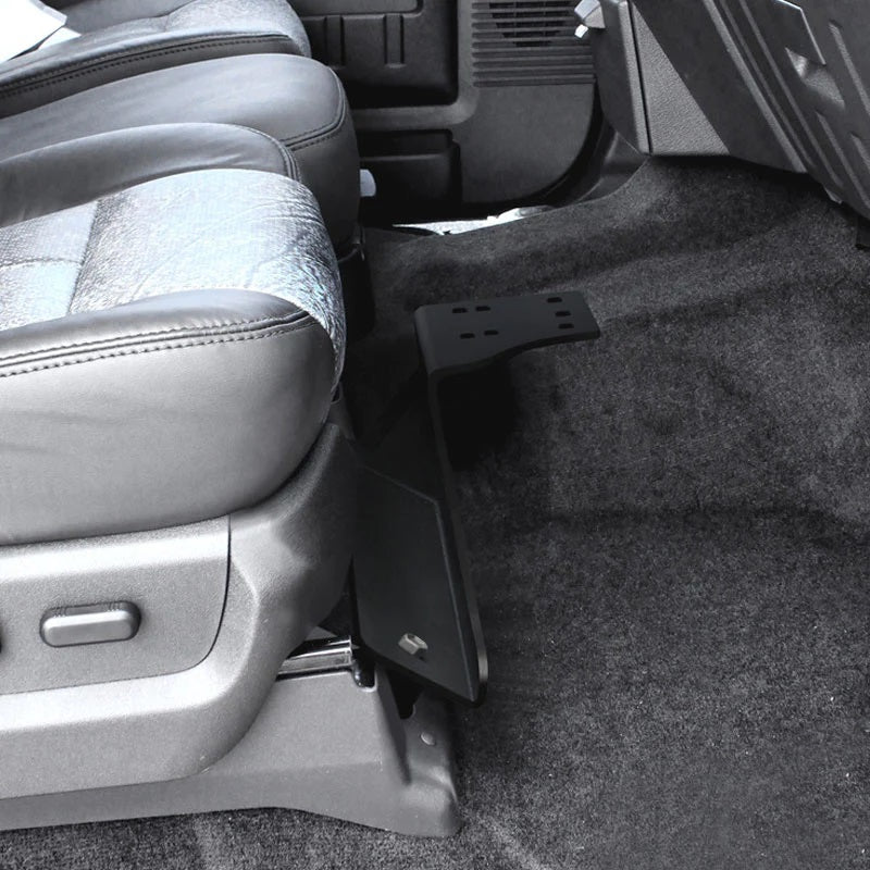 - Installs in minutes with no drilling required on passenger side floor, in front seat using existing seat bolts
