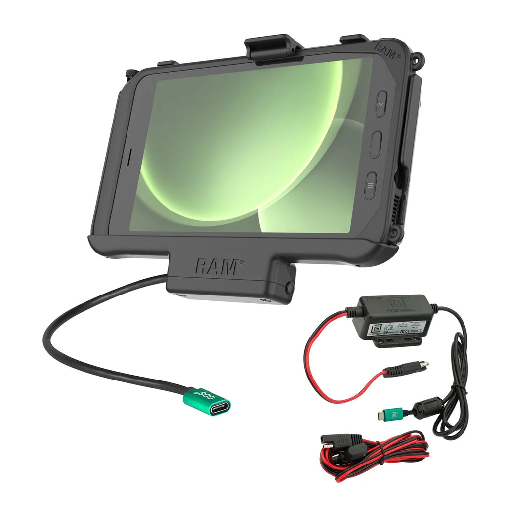 • RAM® EZ-Roll'r™ Powered form-fit cradle provides charging capabilities for the Samsung Galaxy Tab Active5, Tab Active3 and 2 through integrated pogo pin connector and USB-C cable