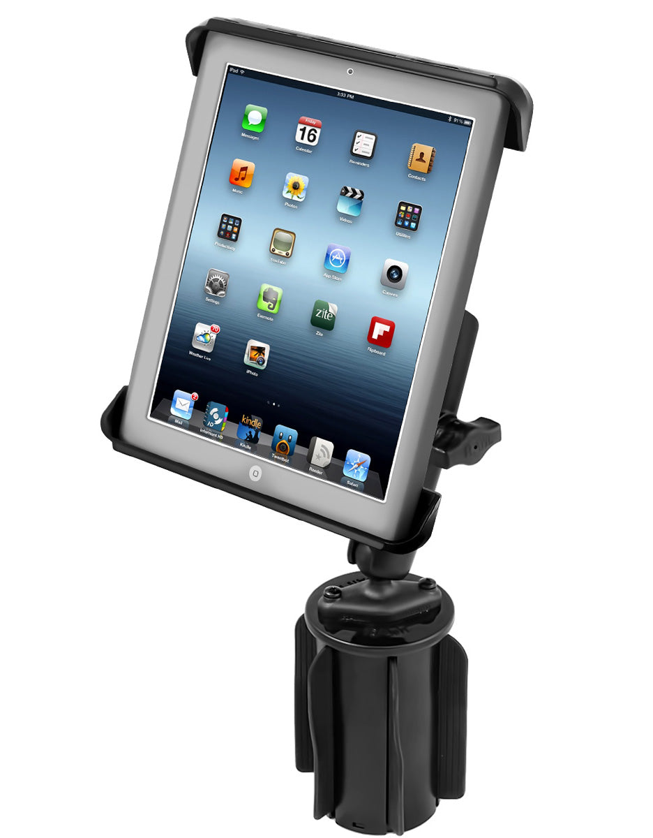 The RAM® Tab-Tite™ Cup Holder Mount for iPad 1–4 offers a secure, adaptable, and travel-ready solution for mounting your tablet in virtually any vehicle. Featuring the RAM-A-CAN™ II weighted cup holder base, a long double-socket arm, round base adapter, and the adjustable Tab-Tite spring-loaded cradle, this kit delivers exceptional stability and unlimited viewing angles.